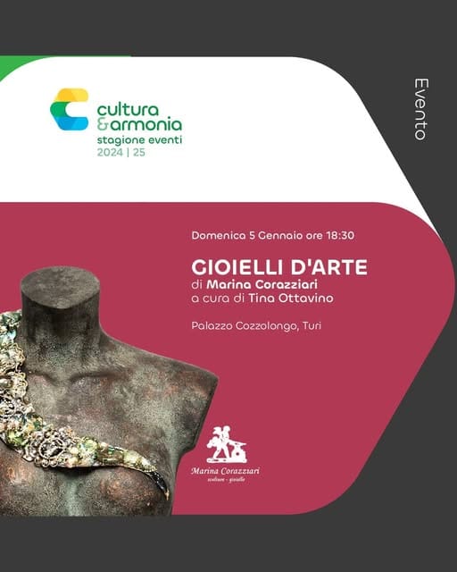 Domenica 𝟓 𝐠𝐞𝐧𝐧𝐚𝐢𝐨, alle 18:30, a 𝐏𝐚𝐥𝐚𝐳𝐳𝐨 𝐂𝐨𝐳𝐳𝐨𝐥𝐨𝐧𝐠𝐨, un appuntamento esclusivo che celebra l’arte e il design dei gioielli firmati da 𝐌𝐚𝐫𝐢𝐧𝐚 𝐂𝐨𝐫𝐚𝐳𝐳𝐢𝐚𝐫𝐢, stilista, scenografa e docente, un obiettivo importante che pone alla mostra antologica di restituire uno spaccato della ricchezza dell’immagine del gioiello, di questi ultimi tempi, creato per essere abbinato al fashion di alta moda, un filo conduttore che ha un grande significato, vuol dire riconoscere il valore che ha l’accessorio prezioso nel sistema culturale contemporaneo.