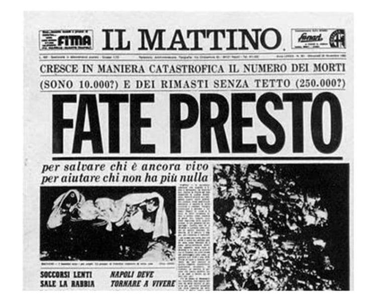 Interi paesi – come Sant’Angelo dei Lombardi, Lioni, Conza della Campania, Castelnuovo di Conza, Santomenna, Laviano, Muro Lucano – furono quasi rasi al suolo, altri gravemente danneggiati e isolati per giorni. Il ricordo dei soccorsi, tardivi e insufficienti nonostante lo sforzo messo in campo dai volontari, è tutt’altro che sbiadito. Simbolo di quella tragedia resta il crollo del soffitto della Chiesa Madre di Balvano, nella provincia di Potenza, che seppellì 66 persone, per la maggior parte bambini e ragazzi, di fatto cancellando un’intera generazione. Il sisma fu avvertito pesantemente anche a Napoli, dove la gente si riversò in strada per passare la notte. Oltre a lasciare profondamente martoriata la Campania, allungò la sua onda a nord fino alla Pianura Padana, e a sud fino alla Sicilia.