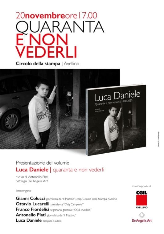 (Avellino)- Sabato 20 novembre alle 17, al Circolo della stampa di Avellino, presentazione del volume Quaranta e non vederli (De Angelis, 2021). Con Antonello Plati, giornalista collaboratore de Il Mattino di Avellino, e Luca Daniele, fotografo documentarista, ci saranno Franco Fiordellisi, segretario generale della Cgil di Avellino, Ottavio Lucarelli, presidente dell’Ordine dei giornalisti della Campania, e Gianni Colucci, giornalista del Mattino.