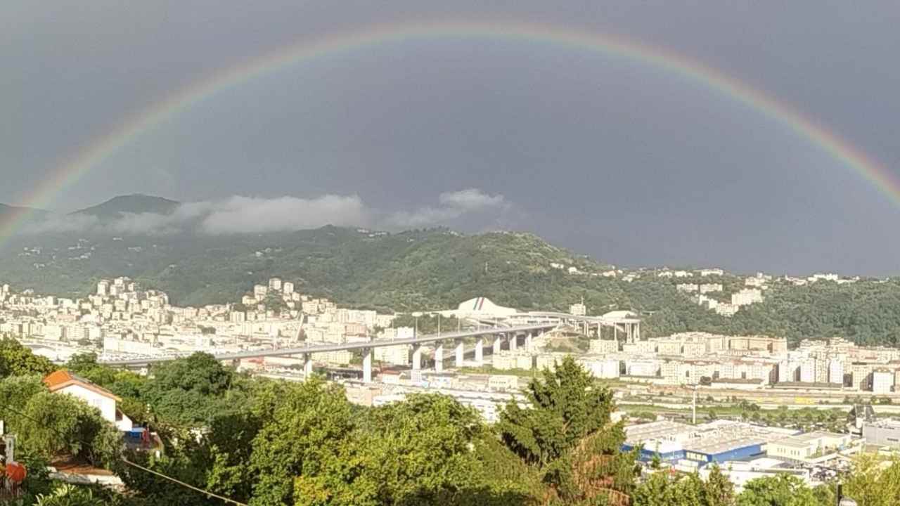Ponte Genova, arcobaleno e Frecce Tricolori all’inaugurazione