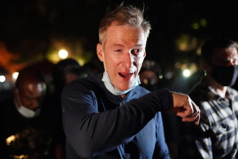 PORTLAND, OR – JULY 22: Portland Mayor Ted Wheeler reacts after being exposed to tear gas fired by federal officers while attending a protest against police brutality and racial injustice in front of the Mark O. Hatfield U.S. Courthouse on July 22, 2020 in Portland, Oregon. State and city elected officials have called for the