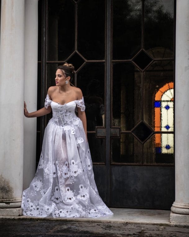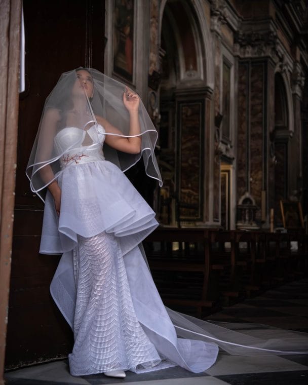 Nasce sempre da un sogno. È lì che tutto prende forma. Poi arriva la donna, con la sua personalità, il suo modo di essere, e infine il tessuto, che dà concretezza a quell’idea iniziale. È un processo naturale, quasi istintivo: ogni elemento si intreccia con l’altro fino a trasformarsi in un abito.