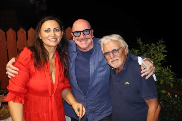 Giò Di Sarno, che quest’anno ha condotto con successo il format “L’Emigrante” su Radio Italia Anni 60, si è rivelata, insieme agli splendidi figli Alessandro e Beatrice Mazzoni, una padrona di casa super accogliente, in grado di mettere a proprio agio tutti gli ospiti, dal primo all’ultimo. Il clou si è avuto quando è stata servita una enorme zuppiera con una specialità gastronomica preparata al momento dalla stessa Di Sarno: mezze maniche con pomodoro, basilico, melanzane e provola affumicata. Un piatto talmente squisito da far perdere il proverbiale self-control al regista Campanella, che si è letteralmente avventato sulla portata, sgomitando in modo sfacciato sotto gli sguardi attoniti dei presenti. Una scena molto simpatica. Irrinunciabile il taglio della torta e il brindisi collettivo, a suggello di una festa davvero riuscita, nonostante fosse stata organizzata “last minute”.