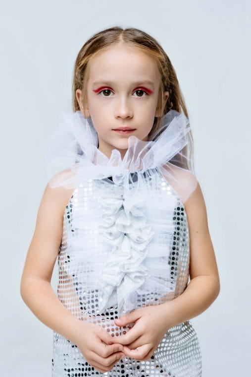 I materiali in cui è realizzata la collezione includono maglieria in cotone ipoallergenico, stoffe di altissima qualità e raffinata rete in tulle. Gli elementi decorativi distintivi sono paillettes, perline applicate a mano e nastri colorati. La gamma di colori della collezione comprende una combinazione di tonalità accese e audaci in tinte unisex come giallo, rosso, bianco e nero, accostate a impeccabili ed eleganti sfumature soft di grigio e beige.