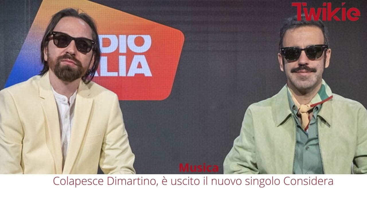 Dopo il grande successo di Splash, il singolo di Colapesce Dimartino certificato disco di platino, vincitore del Premio della Critica Mia Martini, nonché del Premio Lucio Dalla sul palco del 73° Festival di sanremo , il duo di cantautori siciliani torna sulla scena con Considera, un nuovo brano pop esistenzialista. Se Splash, infatti, rappresentava un tuffo nella profondità della vita quotidiana, con questo nuovo singolo, Lorenzo Urciullo e Antonio Di Martino (in arte Colapesce Dimartino) ci invitano invece a guardare le stelle. Il nuovo singolo, è stato accompagnato da un divertente cortometraggio, uscito nella giornata giovedì 15 giugno: il teaser, racconta in maniera sarcastica e autoironica come nascono le idee per i tormentoni dell’estate. Considera (Numero Uno / Sony Music), prodotta da Federico Nardelli e Giordano Colombo, è disponibile in radio e sulle piattaforme digitali a partire da oggi, venerdì 16 giugno.